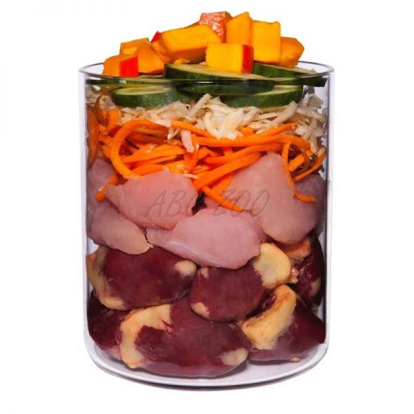 Zloženie: Morčacie mäso 51 % (morčacie srdce 31 %, morčací žalúdok 12 %, morčacia svalovina 5 %, morčacia koža 3 %), vývar 19 %, mrkva 7 %, zeler 7 %*, tekvica 6 %*, uhorka 3 %*, minerály 1 %*, kokosová múka, repkový olej, tekvicová múka, pivovarské kvasnice*, psyllium*, bazalka*, harmanček*, žerucha 0,1 %*, ustricová škrupina*, šípková kôra*, minerálny íl*, spirulina*