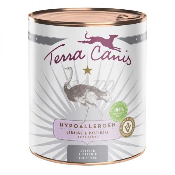 Konzervy Terra Canis z línie HYPOALLERGENIC obsahujú mäso z čistej svaloviny (60 %) z jediného exotického zdroja bielkovín doplnené o nízkoalergénnu zeleninu.  Všetky zložky sú 100% ľudskej kvality. Vhodné pre psov s potravinovými alergiami / intoleranciami a na vykonávanie vylučovacej diéty.