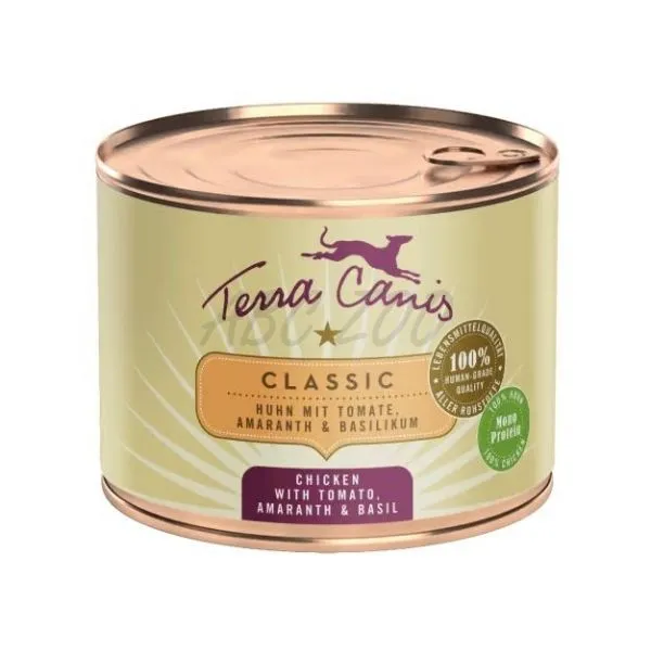 Konzervy Terra Canis z línie CLASSIC obsahujú vysoký podiel mäsa a čerstvej zeleniny, ovocia a byliniek. Na živiny bohaté, ľahké, bezlepkové pseudozrná (napr. proso, amarant, ryža natural) sú pridávané vo veľmi malých množstvách, ktoré sú pre psa ľahko stráviteľné (4 – 10 %). Prírodné prísady (morské riasy, minerálny íl, peľ kvetov, šípky, andská soľ, pivovarské kvasnice) dodávajú dôležité vitamíny, minerály a stopové prvky. Repkový olej poskytuje cenné esenciálne mastné kyseliny. Všetky zložky sú 100% ľudskej kvality.