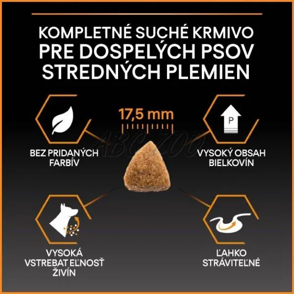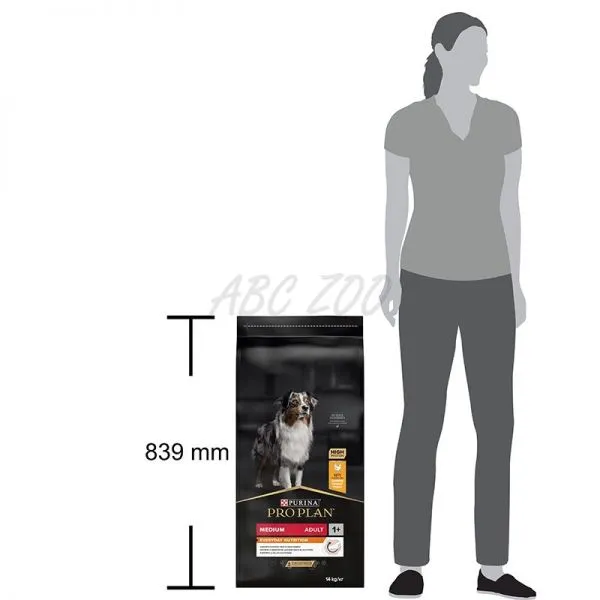 Purina PRO PLAN ADULT Medium je kompletné krmivo s vysokým obsahom kurčaťa, určené pre dospelých psov stredných plemien, vážiacich od 10 do 25 kg.