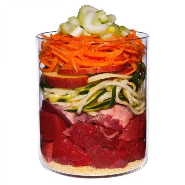 Zloženie: Jahňacie mäso 38 % (jahňacie srdce 30 %, jahňacie pľúca 8 %), vývar 20 %, mrkva 13 %, cuketa 11 %, proso 7 %, jablko 5 %, stonky zeleru 3 %, minerály 1 %*, repkový olej, semená feniklu*, kôpor 0,1 %*, bazalka*, minerálny íl*, pivovarské kvasnice*, lastúra ustrice*, spirulina*