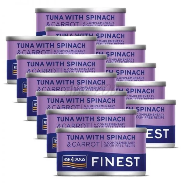 Fish4Dogs Finest Tuna with Spinach je konzerva pre psov s tuniakom, špenátom a mrkvou vyrobená z kvalitných rýb a zeleniny.