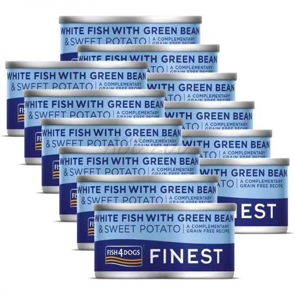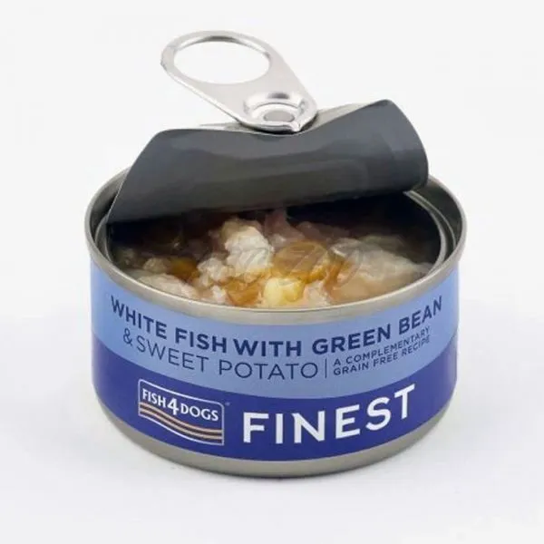 Fish4Dogs Finest White Fish with Green Bean je konzerva pre psov s bielou rybou, fazuľkou a sladkými zemiakmi vyrobená z kvalitných rýb a zeleniny.