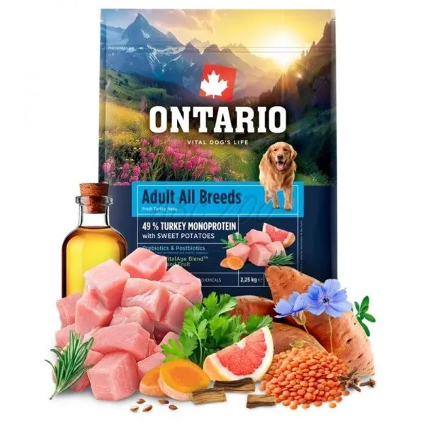 Ontario Adult All Breeds je superprémiové krmivo s morčacím mäsom a sladkými zemiakmi pre dospelé psy všetkých plemien na podporu vitality a zdravého trávenia.