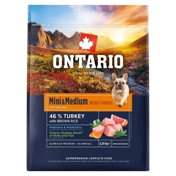 Ontario Mini & Medium Weight Control je superprémiové krmivo s morčacím mäsom a hnedou ryžou pre dospelé psy malých a stredných plemien pre ideálnu kondíciu a kontrolu hmotnosti.