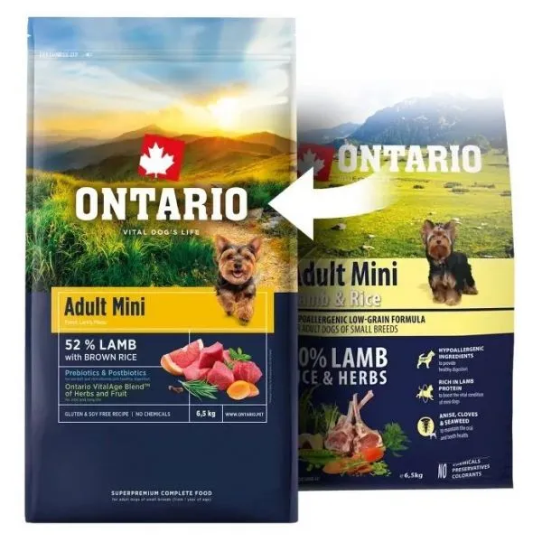 Ontario Adult Mini je superprémiové krmivo s jahňacím mäsom a hnedou ryžou pre dospelé psy malých plemien na správny rast, vývoj svalov, kostí a kĺbov.