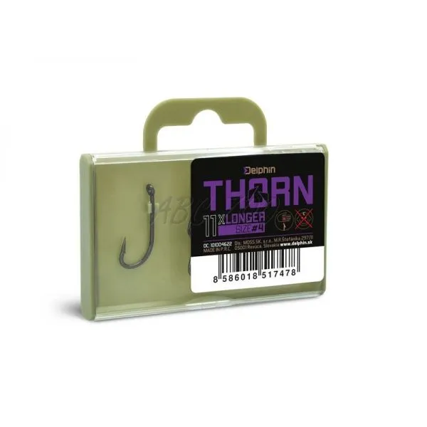 Pomocou aplikovanej technológie Ultrapoint 4.8, bolo možné vytvoriť dlhší hrot, ktorý poskytuje priam neuveriteľnú ostrosť. Háčiky Delphin THORN sú balené v praktickej krabičke, v ktorej bude ich ostrie vždy dôkladne chránené. Na krabičke sa navyše nachádza držiak s očkom na zavesenie do predajní, ktorý je možné poľahky odstrániť odlomením bez akéhokoľvek nástroja, vďaka čomu krabička vo vašej výbave zaberie podstatne menej miesta.