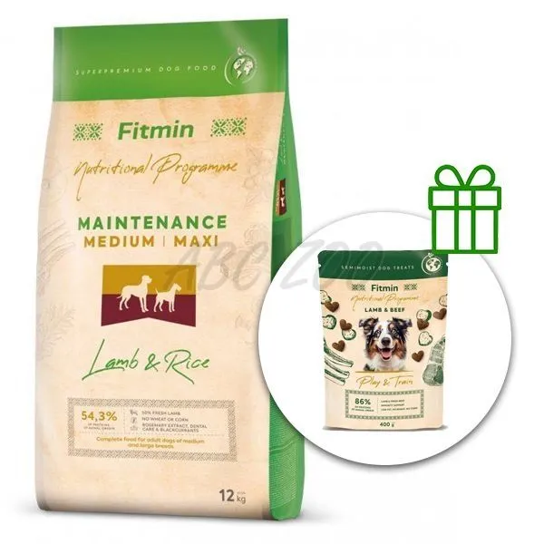 Fitmin Maintenance Medium / Maxi Lamb & Rice 12 kg + Fitmin Play&Train Lamb & Beef ZADARMO