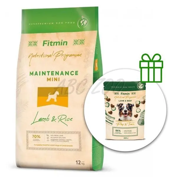 Fitmin Maintenance Mini Lamb & Rice 12 kg + Fitmin Play&Train Lamb & Beef ZADARMO