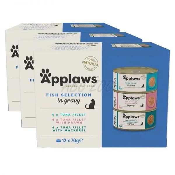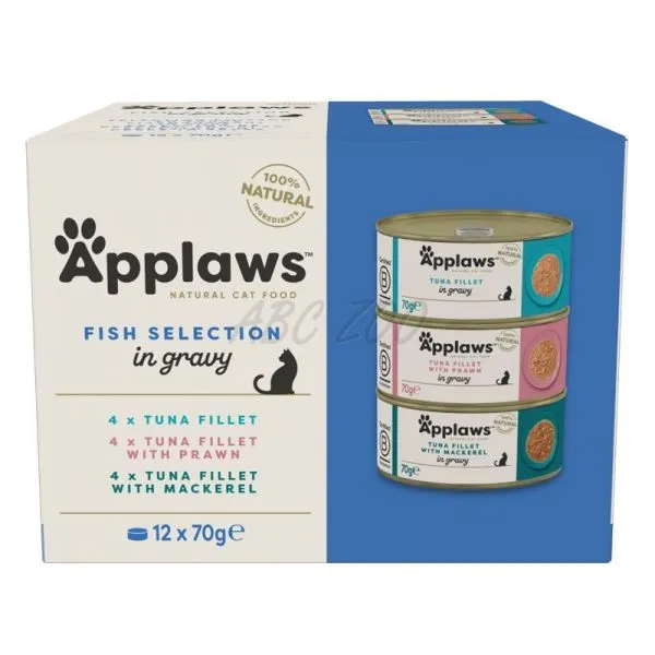 Applaws Fish Selection je prémiový výber 12 konzerv pre dospelé mačky, obsahujúci rôzne druhy prírodného krmiva s vysokým podielom mäsa z rýb.