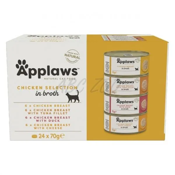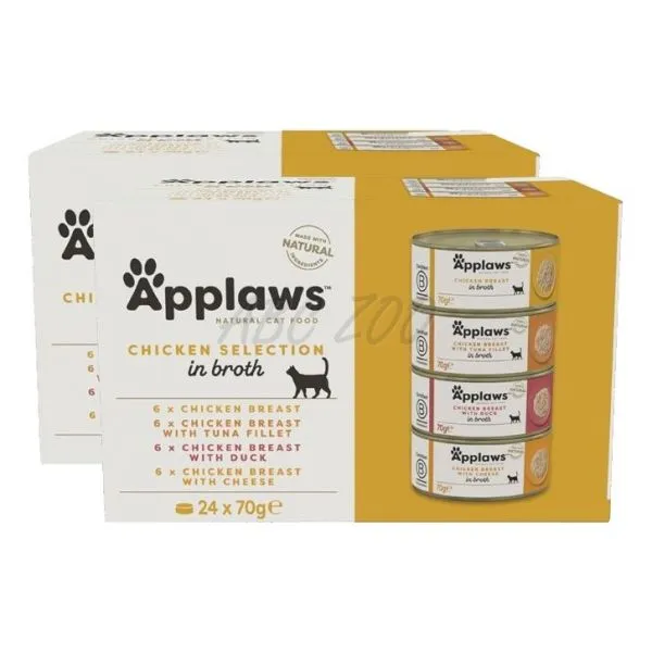 Applaws Chicken Selection je prémiový výber 24 konzerv pre dospelé mačky, obsahujúci rôzne druhy prírodného krmiva s vysokým podielom kuracieho mäsa vo vývare.
