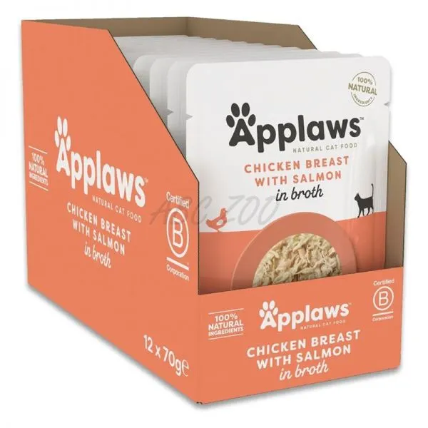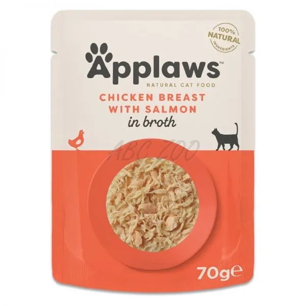 Applaws Chicken Breast with Salmon in Broth je prémiové prírodné krmivo v kapsičke pre mačky, vyrobené z vysokokvalitného mäsa z kuracích pŕs a lososa v lahodnom vývare.