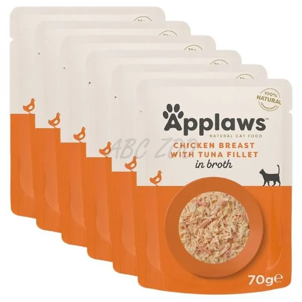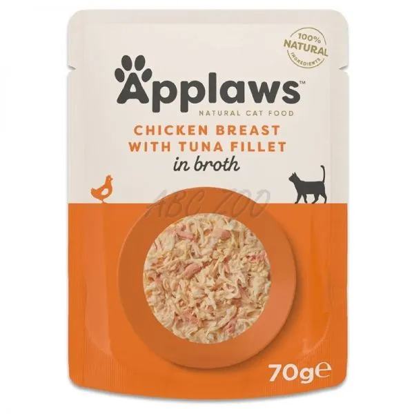 Applaws Chicken Breast with Tuna Fillet in Broth je prémiové prírodné krmivo v kapsičke pre mačky, vyrobené z vysokokvalitného mäsa z kuracích pŕs a tuniaka v lahodnom vývare.