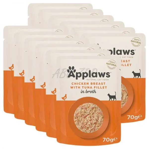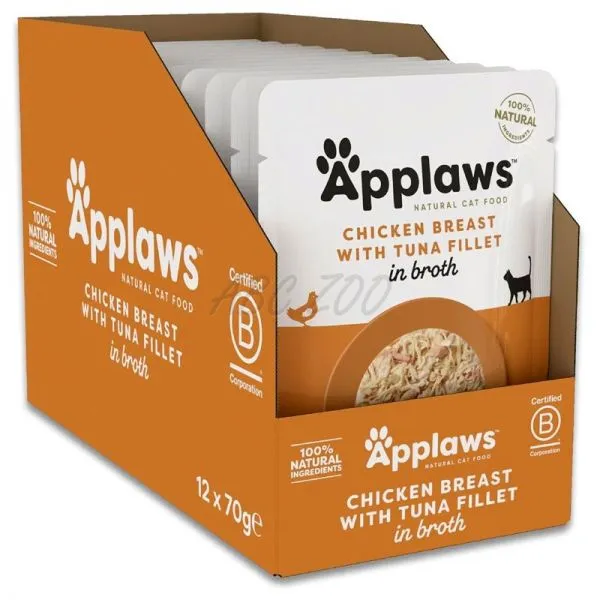 Applaws Chicken Breast with Tuna Fillet in Broth je prémiové prírodné krmivo v kapsičke pre mačky, vyrobené z vysokokvalitného mäsa z kuracích pŕs a tuniaka v lahodnom vývare.