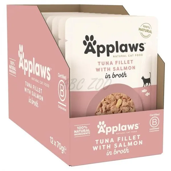 Applaws Tuna Fillet with Salmon in Broth je prémiové prírodné krmivo v kapsičke pre mačky, vyrobené z vysokokvalitného mäsa z tuniaka a lososa v lahodnom vývare.