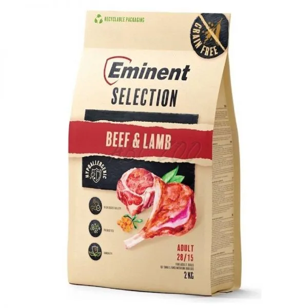 Eminent Selection Adult Beef & Lamb je kompletné bezobilné krmivo s hovädzím a jahňacím mäsom, pre dospelé psy malých a stredných plemien.