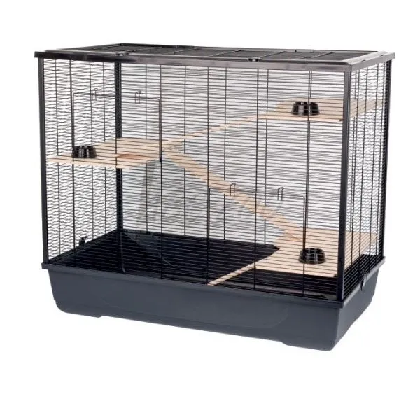 Skladateľná klietka vhodná pre menšie hlodavce, ako myš, škrečok, potkan, či pieskomil alebo iné zvieratká, napr. veveričku. Drevené príslušenstvo a plastové misky. Čierna farba vaničky. Viac detailov