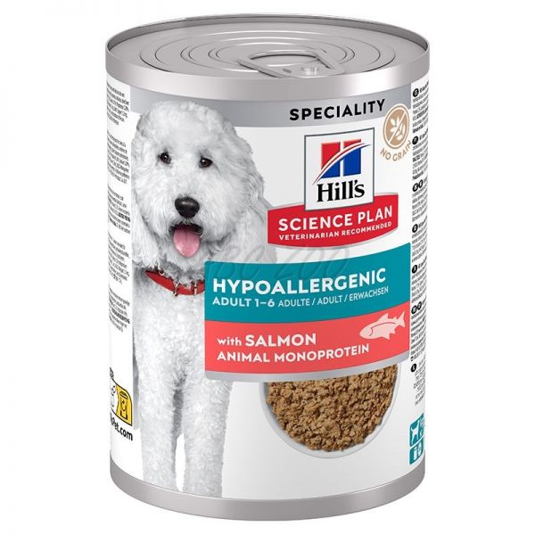 Mokré krmivo pre psy Hill's Science Plan Hypoallergenic s lososom je vyvážené krmivo bez obilnín pre dospelých psov vo veku 1 – 6 rokov. Krmivo s lososom ako jediným zdrojom živočíšnych bielkovín, ľahko stráviteľnými zložkami a omega-3 a omega-6 mastnými kyselinami je vhodné pre citlivý žalúdok, podporuje zdravú pokožku a môžete ho podávať spolu s inými krmivami.