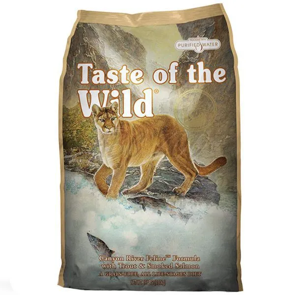 TASTE OF THE WILD Canyon River Feline je kompletné krmivo vo forme granúl, určené pre mačky každého veku a všetkých druhov. Krmivá tejto značky sú nositeľom prestížnych medzinárodných ocenení a sú zaradené v zozname Top Dry Foods.