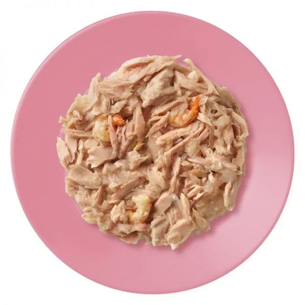 Zloženie: Filet z tuniaka 55%, krevety 5%, ryžová múka, rastlinné želírovacie činidlo