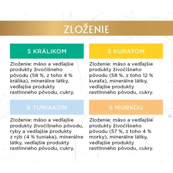 S tuniakom: mäso a výrobky živočíšneho pôvodu, ryby a vedľajšie výrobky z rýb (tuniak 4 %), minerálne látky, vedľajšie výrobky rastlinného pôvodu, cukry