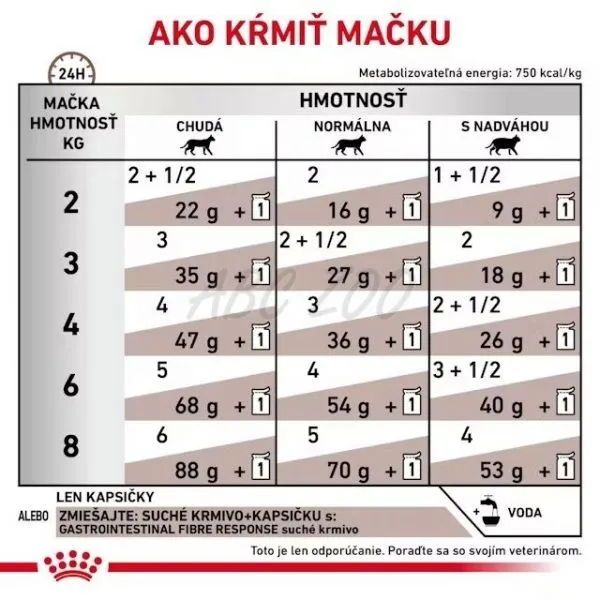 V prípade, že objednáte veterinárne granuly alebo konzervy, potvrdzujete tým, že vaša mačka bola vyšetrená veterinárom a ten na základe stanovenej diagnózy odporučil užívanie vami vybraného krmiva. Stav svojej mačky a odporúčané krmivo nezabudnite konzultovať s veterinárom minimálne raz za 6 mesiacov. Ak sa počas užívania krmiva stav vašej mačky zmení, vyhľadajte pomoc zverolekára.