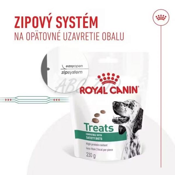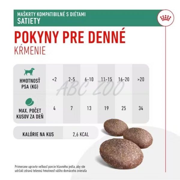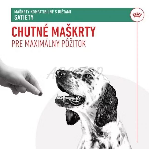 Maškrty ROYAL CANIN® SATIETY Treats majú menej ako 3 kalórie na kus a obsahujú vysoký obsah bielkovín, takže sú vhodnou voľbou ako doplnok diéty na reguláciu hmotnosti.