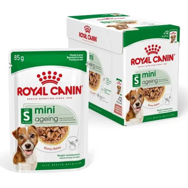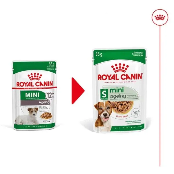 ROYAL CANIN® Mini Ageing v omáčke, vhodný pre malé psy staršie ako 8 rokov s hmotnosťou do 10 kg, je špeciálne vytvorený s ohľadom na všetky nutričné ​​potreby mini psa.