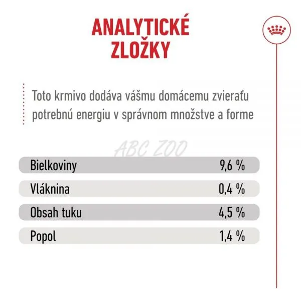ANALYTICKÉ ZLOŽKY: Bielkoviny: 9,6 % - Vláknina: 0,4 % - Obsah tuku: 4,5 % - Popol: 1,4 % - Vlhkosť: 79,1 % - Kyselina linolová: 1,4 % - Fosfor: 0,14 % - EPA+DHA: 0,16 % - Beta-karotén: 3,7 mg/kg – Lykopén: 1,6 mg/kg – Vitamín A: 9300 IU/kg – Metabolizovateľná energia: 954 kcal/kg.