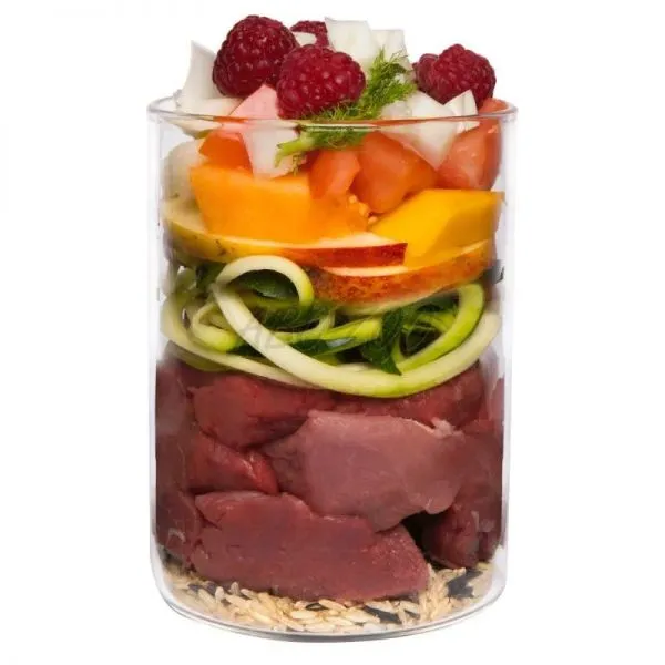 Pomer Mäso : ryža natural: zelenina/ovocie/bylinky : ostatné suroviny = 69 % : 5 % : 24 % : 2 %