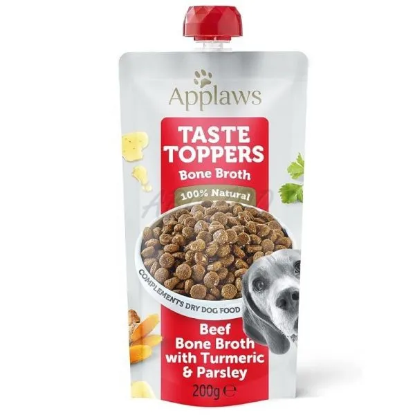 Applaws Dog Taste Toppers in Bone Broth je prémiová kapsička pre psov, ktorá obsahuje hovädzí vývar z kostí s kurkumou a petržlenovou vňaťou.