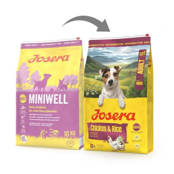 Josera Mini Chicken & Rice je prispôsobené špeciálnym potrebám malých psov - s príslušne malou veľkosťou granúl. Bezlepková receptúra s kuracím mäsom a ryžou je dobre tolerovaná a chutná – ideálne pre psov s citlivým zažívaním. Zložky, ako sú cenné mastné kyseliny, vitamíny, zinok a meď, zabezpečujú krásnu, lesklú srsť a krásnu pokožku. Miniwell sa teraz volá Mini Chicken & Rice. V novom dizajne, ale s rovnakou osvedčenou receptúrou.