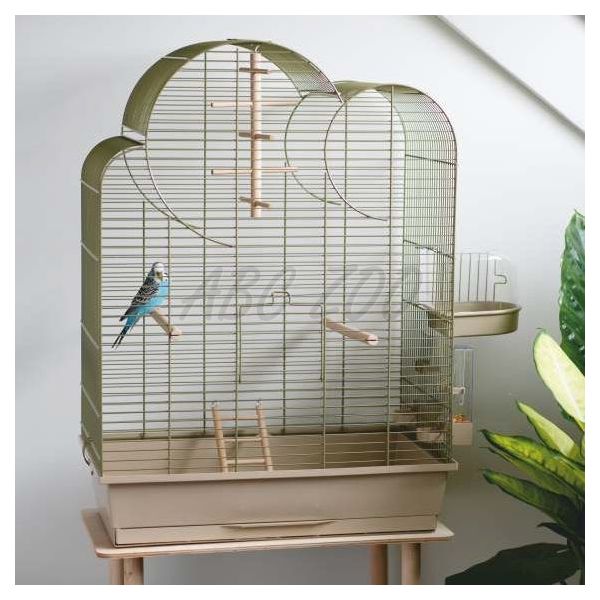 Elegantná klietka pre papagáje s kompletnou výbavou. Zelená mriežka, béžová vanička. Viac detailov