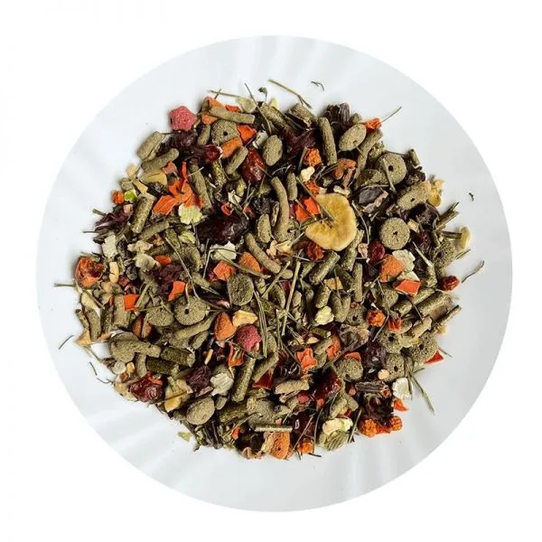Výberová a vyvážená kŕmna zmes pre morčatá vhodná na dlhodobé kŕmenie, bohatá na celé kusy zeleniny, ovocia, chrumiek a ďatelinové krúžky.