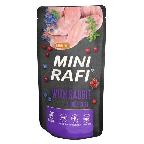 Rafi je kompletné bezobilninové mokré krmivo v kapsičke, s králičím mäsom, čučoriedkami a brusnicami, pre dospelé psy malých plemien.
