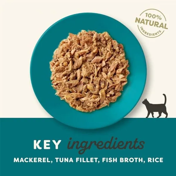 Zloženie: Makrela 45%, Filet z tuniaka 30%, Rybí vývar, Ryža