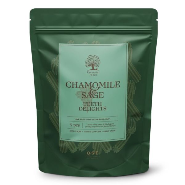 Essential Foods prírodné dentálne pochúťky pre psov s harmančekom a šalviou pre zdravé zuby a svieži dych.