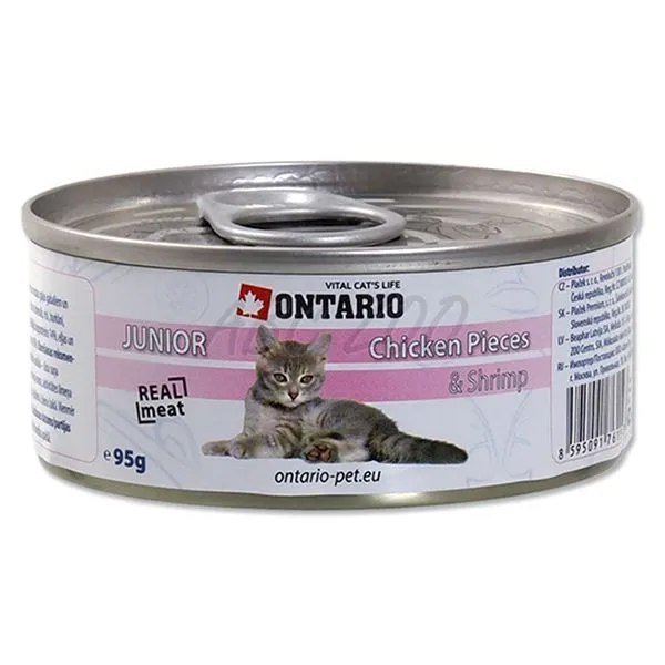 Konzerva pre mladé mačky Ontario - kuracie kúsky a krevety. Viac detailov