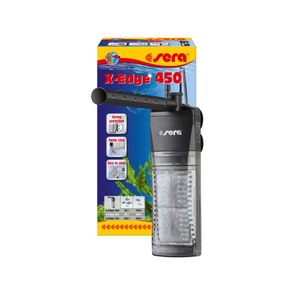Rohový filter sera X-Edge 450, filtračná vata, filtračná pena, biologické filtračné médium sera siporax mini Professional, rozstrekovacia rampa, výtoková tryska „kačací zobák“, Air-Set, držiak s prísavkami.