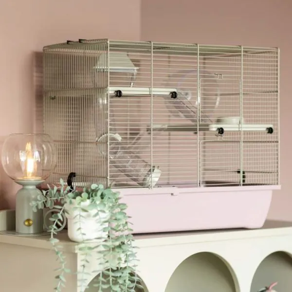 Dizajnová klietka pre menšie hlodavce s kompletným príslušenstvom. Dizajnové prevedenie Pastel. Ružová farba vaničky. Viac detailov