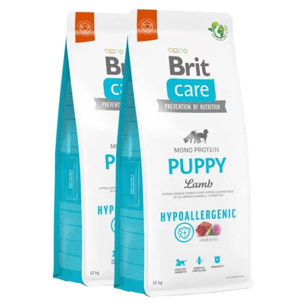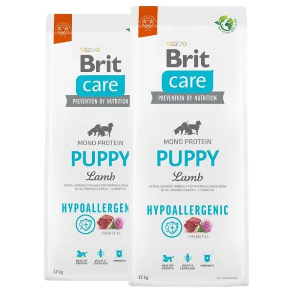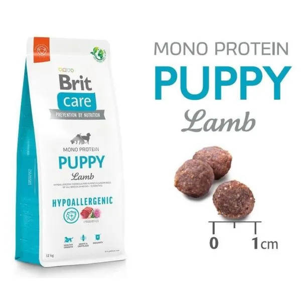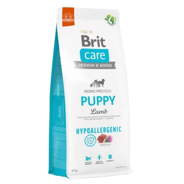 Brit Care Hypoallergenic je superprémiové hypoalergénne krmivo s jediným druhom živočíšneho proteínu pre prevenciu alergickej reakcie na krmivo, s jahňacím mäsom pre šteňatá (od 4 týždňov do 12 mesiacov) všetkých plemien.