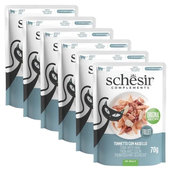 Schesir Complements je doplnkové krmivo s tuniakom a morskou šťukou v želé, pre dospelé mačky všetkých plemien.