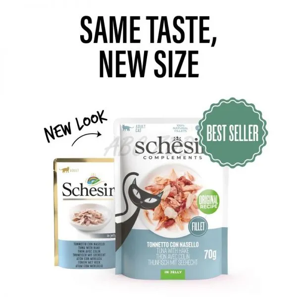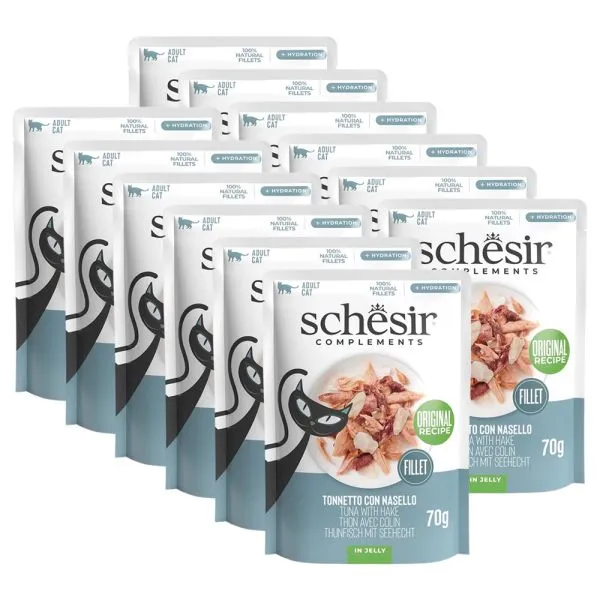 Schesir Complements je doplnkové krmivo s tuniakom a morskou šťukou v želé, pre dospelé mačky všetkých plemien.