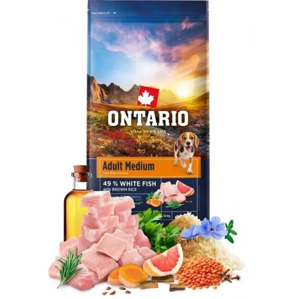 Ontario Adult Medium je superprémiové krmivo s mäsom z bielych rýb a hnedou ryžou pre dospelé psy stredných plemien na podporu vitality a zdravého trávenia.
