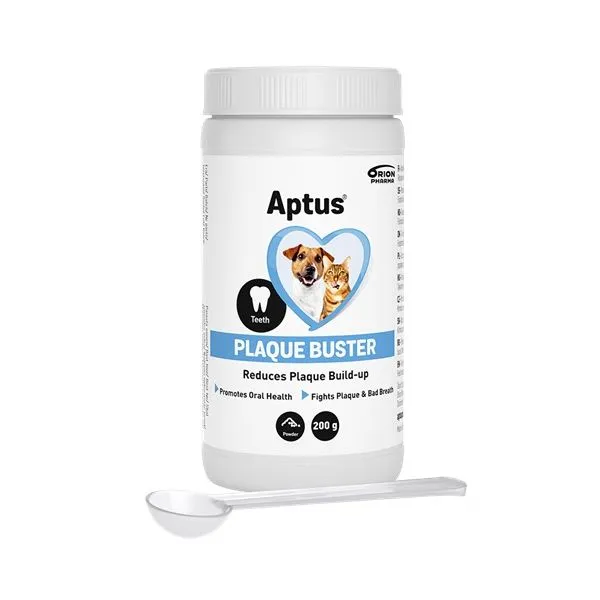 Aptus Plaque Buster powder je prírodný doplnok stravy určený na zníženie zubného povlaku a kameňa u psov a mačiek. Obsahuje morskú riasu Ascophyllum nodosum, ktorá prispieva k lepšiemu ústnemu zdraviu a sviežemu dychu. Prášok sa jednoducho pridáva do dennej kŕmnej dávky a dlhodobým používaním pomáha predchádzať problémom so zubami a ďasnami.