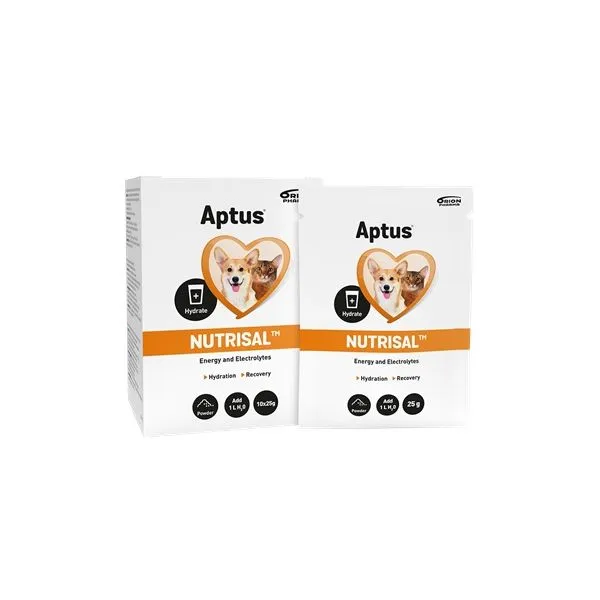 Aptus Nutrisal je výživový doplnok vo forme prášku, ktorý podporuje hydratáciu a regeneráciu zvierat.
