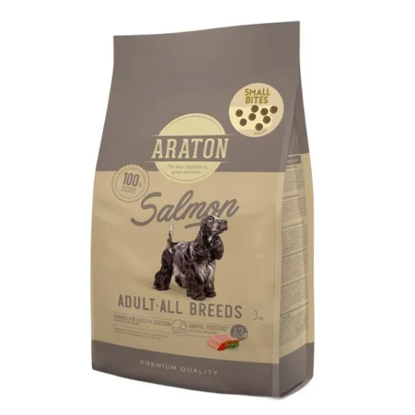 ARATON Dog Adult Small Salmon je prémiové krmivo pre dospelých psov malých plemien, s lahodným lososom a ryžou pre optimálnu výživu a zdravie.