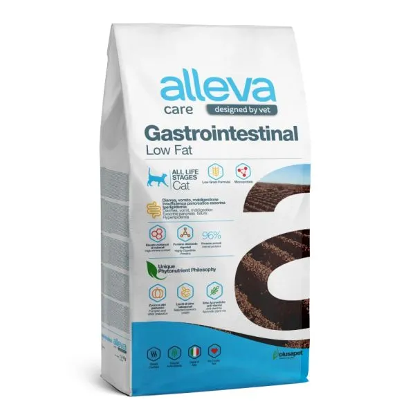 Alleva Care Gastrointestinal Low Fat je vysoko stráviteľné krmivo s nízkym obsahom tukov, zvýšeným obsahom sodíka a draslíka a vyberaným zdrojom rozpustnej vlákniny (psyllium, tekvica, XOS) a iných prebiotík. Receptúra je obohatená o komplex fytonutrientov z bylín, ktoré sú prospešné na zmiernenie hnačky a pre zdravie tráviaceho traktu a o komplex troch kmeňov vyberaných a vysoko čistených kvasiniek, schopných viazať patogény a podporiť imunitu v tráviacom trakte. Odporúča sa tiež ako podpora metabolizmu tukov v prípadoch hyperlipidémie.