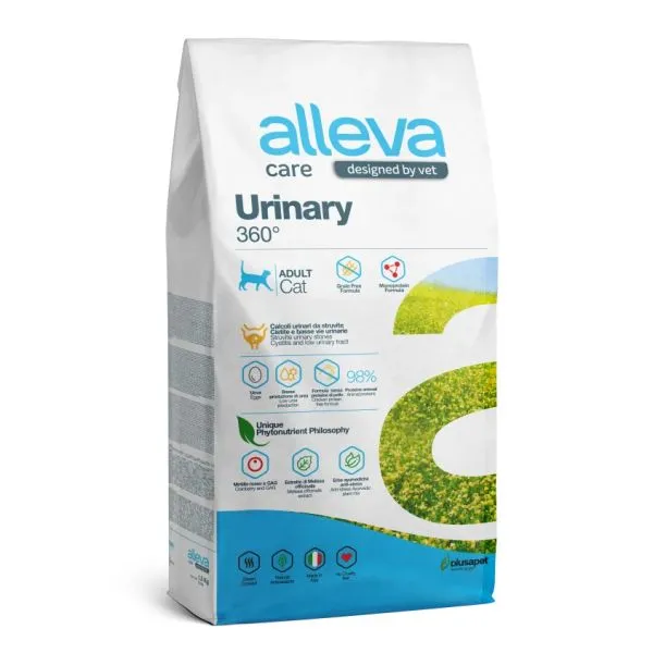 Alleva Care Urinary 360° je diétne krmivo s nízkym obsahom bielkovín (z celých vajec) a minerálov, ktoré prispieva k zníženiu tvorby urey a obmedzeniu vzniku struvitových kryštálov v moči. Vďaka okysľujúcej receptúre (DL-metionín, síran vápenatý) pomáha upraviť pH moču, čím vytvára prostredie nevhodné pre tvorbu kameňov. Obsahuje glukozamín, chondroitín, brusnice a bylinný komplex na podporu močových ciest, ako aj medovku na zníženie stresu.