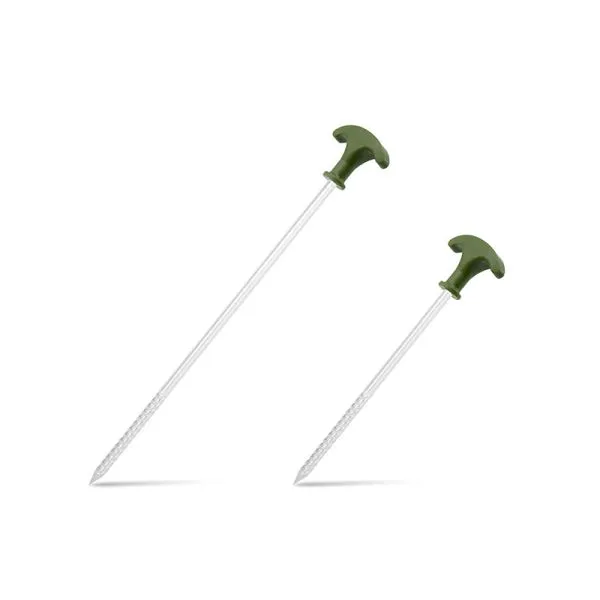 Set náhradných kolíkov, pomocou ktorého si môžete doplniť alebo nahradiť svoje kolíky k bivaku, prípadne vylepšiť slabšie a tenšie typy k dáždnikom alebo k iným menším prístreškom. Disponujú plne uzavretými plastovými madlami zelenej farby, ktorých výhodou je, že sa ani po dlhšej dobe zabíjania do zeme nezačnú uvoľňovať a zosúvať po kovovej tyčke smerom nadol. Vrták s odolným štvorhranným hrotom napomáha jednoduchšiemu zapichnutiu do tvrdej a suchej pôdy. Hroty sú pri kúpe opatrené transparentnými ochrannými krytkami pre zvýšenie bezpečnosti.